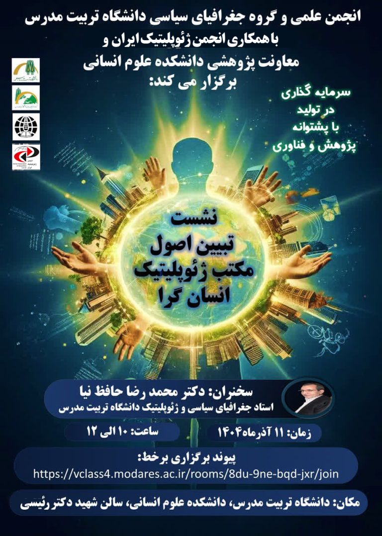 انجمن علمی_دانشجویی جغرافیای سیاسی دانشگاه تربیت مدرس با همکاری انجمن ژئوپلیتیک ایران برگزار می کند.